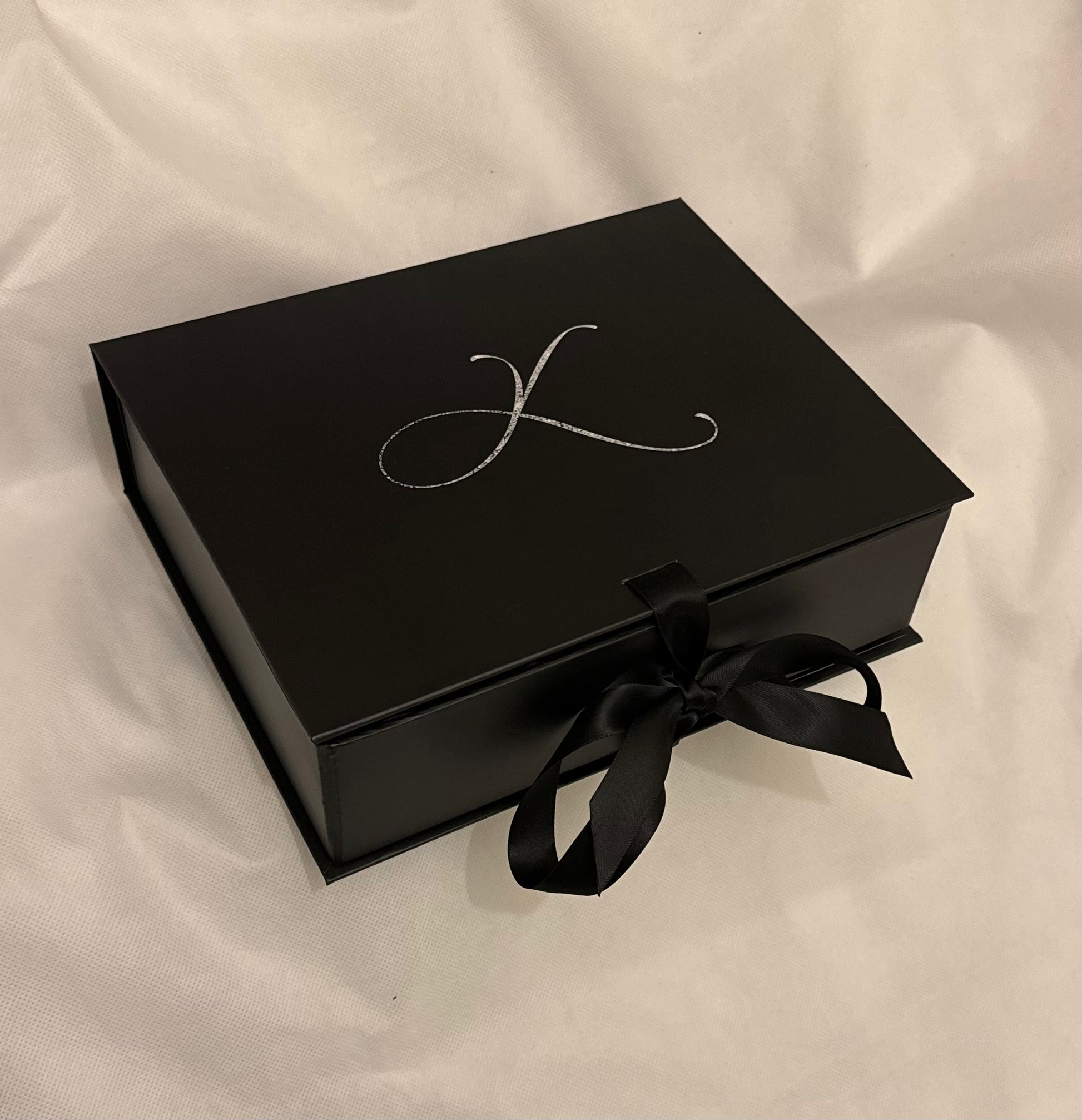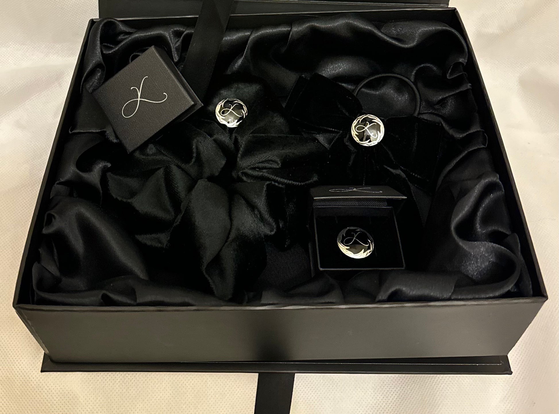 The K Luxé deluxe packaging includes a sleek matte black box with a black satin ribbon. A black satin cushioning is seated within the box to store your items. Store hair accessories, our lapel pins and other items you treasure for a cherishing heirloom.